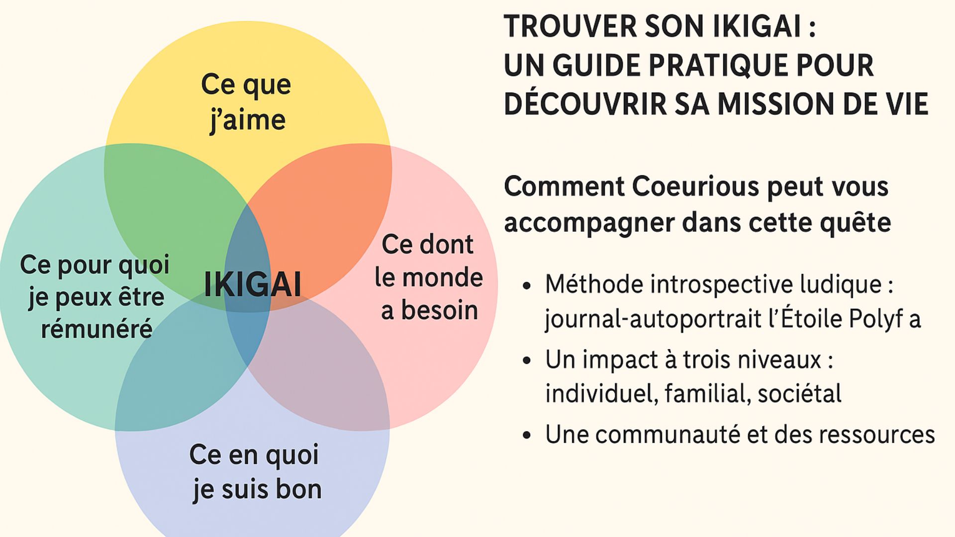 Le concept japonais d’Ikigai illustre bien cette quête : il unit plaisir, talents et contribution au monde. Votre mission de vie n’est pas uniquement un objectif professionnel :elle résulte de l’alignement entre ce que vous aimez, ce que vous savez faire et ce que vous pouvez offrir aux autres.